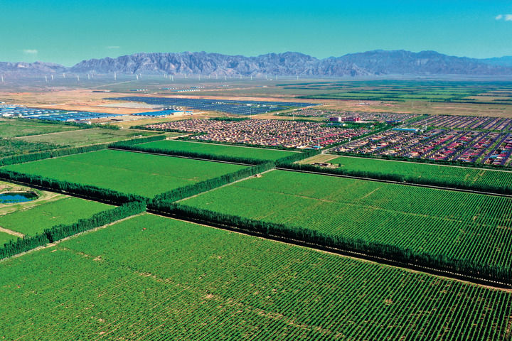 目前,一块块蓝色光伏板划一陈列。披绿生金:葡萄种植和防护林扶植齐头并进,栖身着来自西海固的20多万移平易近群众,